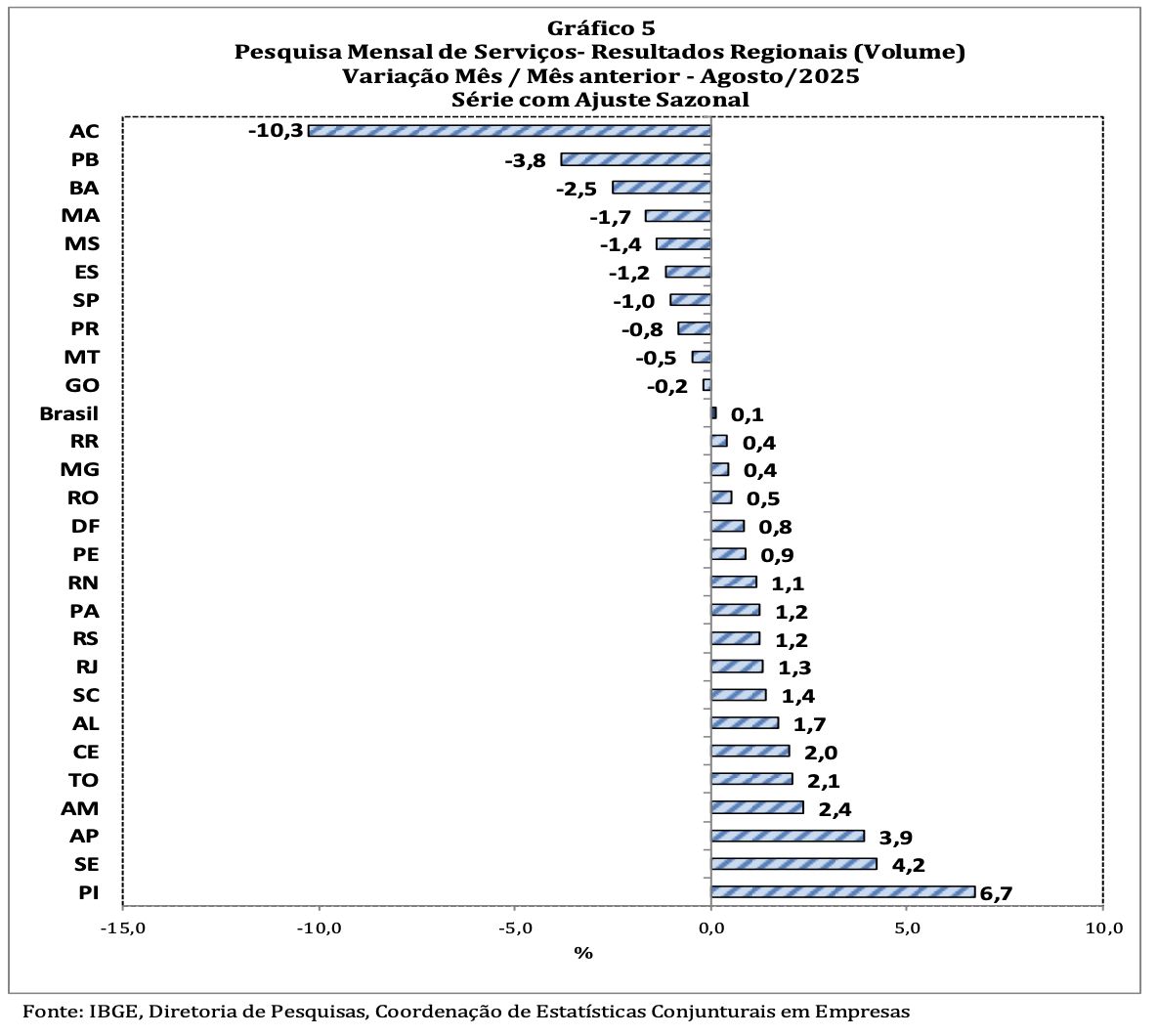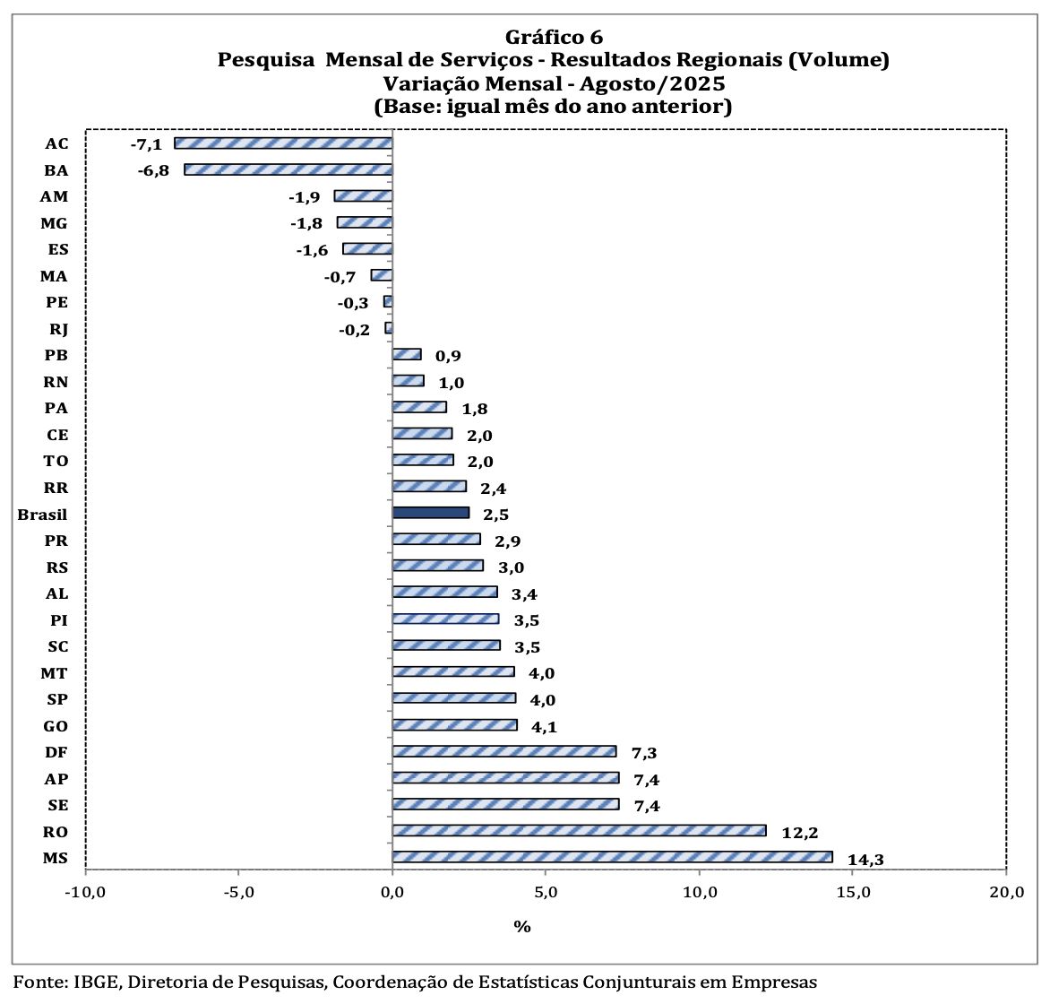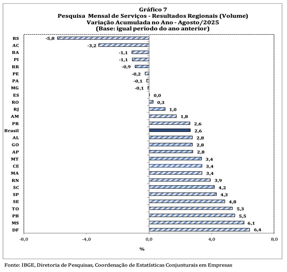 No acumulado de janeiro a agosto de 2025, o setor de serviços expandiu 2,6%, com quatro das cinco atividades com taxas positivas e crescimento em mais da metade (51,2%) dos 166 tipos de serviços. Entre os setores, a contribuição positiva mais relevante ficou com informação e comunicação (5,5%), impulsionado, em grande parte, pelo aumento das receitas das empresas que atuam nos segmentos de portais, provedores de conteúdo e outros serviços de informação na Internet; desenvolvimento e licenciamento de softwares; consultoria em tecnologia da informação; tratamentos de dados, provedores de serviços de aplicação e serviços de hospedagem na Internet; suporte técnico, manutenção e outros serviços em tecnologia da informação; e desenvolvimento de programas de computador sob encomenda.