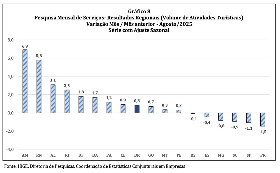 O índice de atividades turísticas cresceu 0,8% em agosto, frente ao mês imediatamente anterior (com ajuste sazonal), após três resultados negativos seguidos, período em que acumulou perda de 2,1%. Com isso, o segmento de turismo está 11,5% acima do patamar de fevereiro de 2020 e 2,0% abaixo do ápice da série histórica (dezembro de 2024).