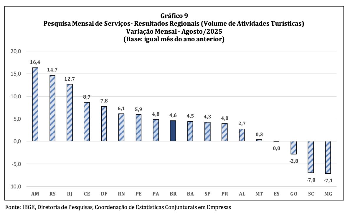 Na comparação com agosto de 2024, o índice de atividades turísticas nacional apresentou expansão de 4,6%, 15º resultado positivo seguido, sendo impulsionado, principalmente, pelo aumento na receita de empresas que atuam nos ramos de transporte aéreo de passageiros; serviços de bufê; e hotéis.