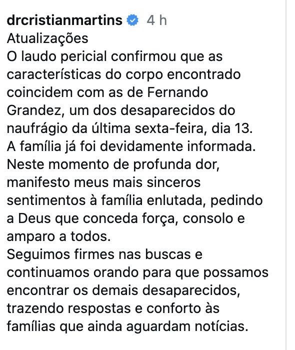 O vice-prefeito e secretário de Assistência Social de Nova Olinda do Norte (AM), Cristian Martins, informou, em suas redes sociais, que o Instituto Médico Legal (IML) do Amazonas confirmou que é do músico Fernando Grandez, de 39 anos, o corpo encontrado pelo Corpo de Bombeiros do Estado (CBMA) nesta segunda-feira (16/02).