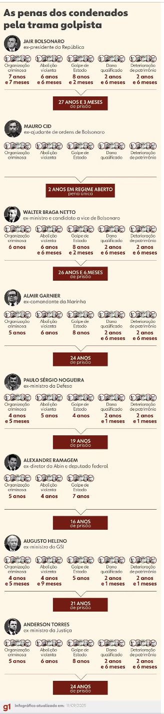 – Jair Bolsonaro, ex-presidente: pena de 27 anos e 3 meses de prisão, inicialmente em regime fechado. O ex-presidente também foi condenado a pagar 124 dias de multa (dois salários mínimos por dia) com penas somadas dos cinco crimes. Os ministros aplicaram a atenuante da idade porque o ex-presidente tem mais de 70 anos. Segundo Moraes, ele tem a pena maior por ser o líder da organização criminosa.